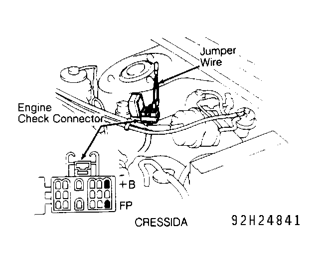 - Tighten union bolt. Reconnect negative battery cable. Install jumper wire between +B and FP terminals of engine check connector. See Figure-3. Turn ignition on and note fuel pressure. Fuel pressure should be within specification. See FUEL PUMP PERFORMANCE table.