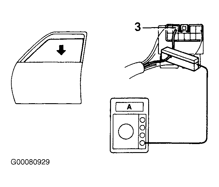 - Check that the current increases approximately 14.5 amps or more when the window stops going down. If operation is as specified, replace the master switch.