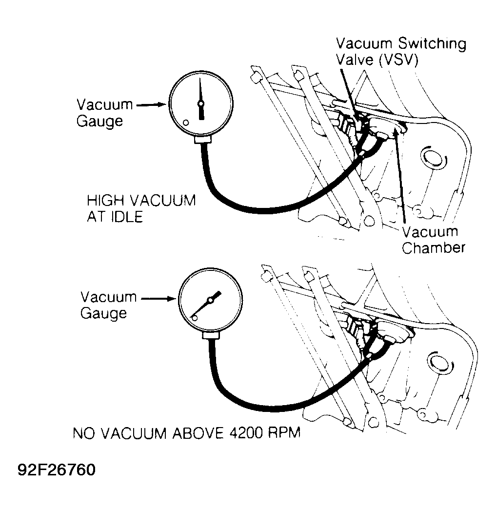 2. Start engine. Vacuum gauge should indicate high vacuum at idle. Increase engine speed to greater than 4200 RPM. No vacuum should be indicated on vacuum gauge. If system does not operate correctly, proceed to step 3). If system operates correctly, all components are okay.