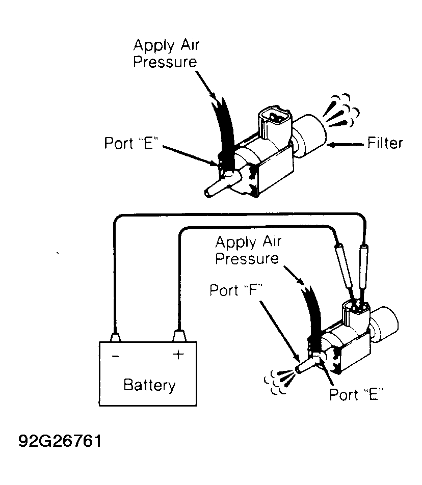 5. Apply air pressure to port "E" and ensure air passes out the filter. See Fig 2. Connect battery voltage to VSV terminals. Apply air pressure to port "E" and ensure air passes out port "F". See Fig 2. Replace VSV if defective and recheck system operation. If VSV is okay, check wiring circuit. See appropriate wiring diagram in WIRING DIAGRAMS article in the ENGINE PERFORMANCE Section.
