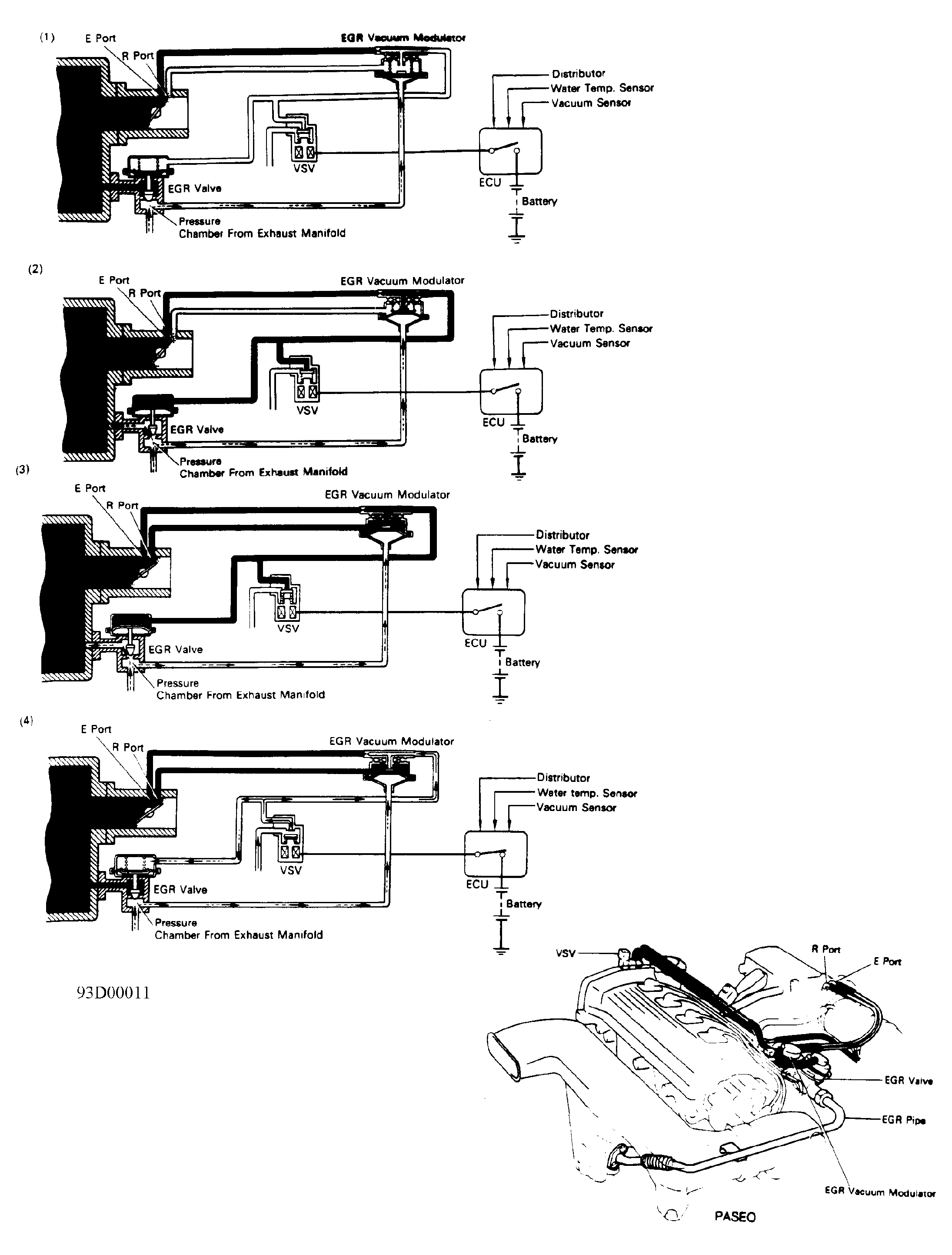 - Using additional hose, connect port "R" directly to intake manifold. High vacuum reading should be obtained at specified engine RPM. See EGR SPECIFICATIONS table.NOTE: Engine should misfire due to large amounts of exhaust gas being injected into intake manifold.