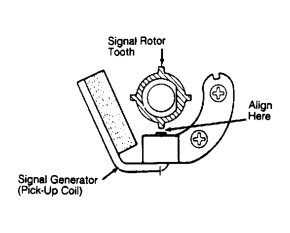 4. Turn distributor to align signal rotor tooth with signal generator (pick-up coil) projection. See Fig 2. While holding distributor in this position, snug tighten distributor hold-down bolt. Install distributor cap and spark plug wires. Connect distributor electrical connector.