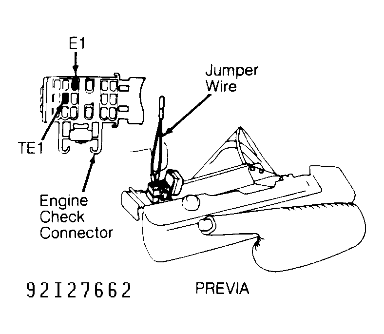 2. Apply parking brake and place transmission/transaxle in Neutral. Install jumper wire between terminals TE1 and E1 of engine check connector. See Fig 1.
