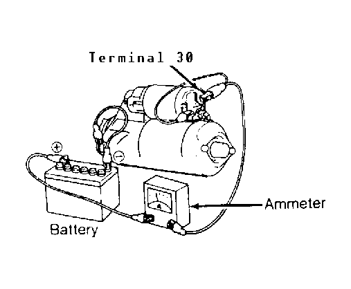 1. Remove starter from engine. Connect ammeter in series between starter motor terminal No. 30 (battery terminal) and a fully charged 12-volt battery. Connect battery negative to starter case ground. See Fig 1 or Fig 2 . Connect voltmeter to battery to observe voltage draw readings.