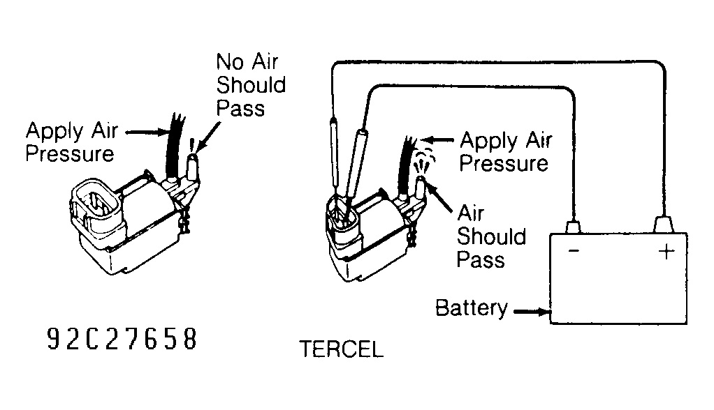 2. Using ohmmeter, measure resistance between VSV electrical terminals. Replace VSV if resistance is not 37-44 for Tercel. Check that no continuity exists between each electrical terminal and VSV body.