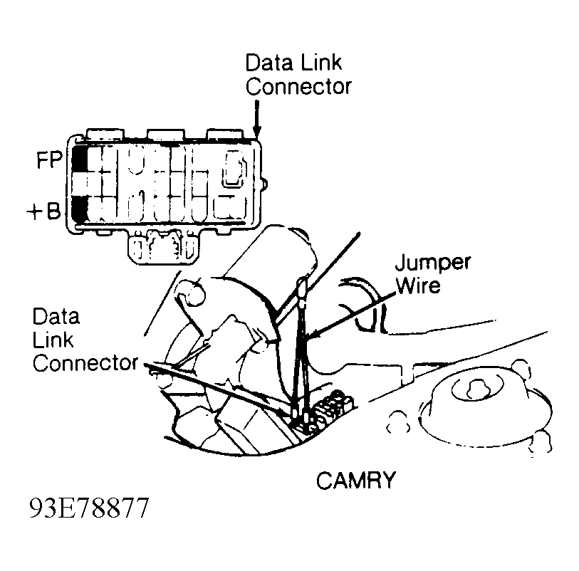 - Install jumper wire between +B and FP terminals of data link connector. See Figure. The data link connector is located in engine compartment.
