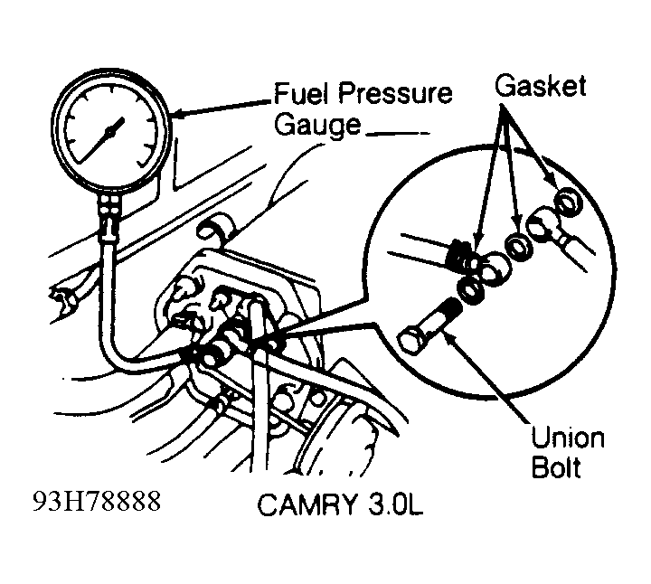 - Remove union bolt and gaskets. Install Fuel Pressure Gauge (SST 09268-45012) using NEW gaskets. See Fig 1. Tighten union bolt. Reconnect negative battery cable.