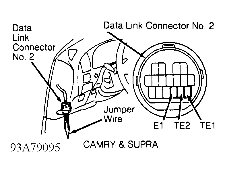 - Install Jumper Wire (SST 09843-18020) between terminals TE2 and E1 in Data Link Connector (DLC) with ignition off. See Fig 1.NOTE: On Camry, DLC No. 2 is used. See Fig 1.