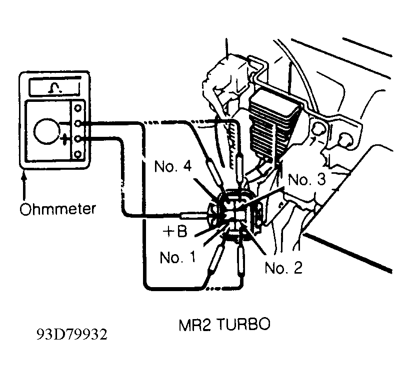 - Ensure ignition is off. Disconnect fuel injector solenoid resistor electrical connector. See FUEL INJECTOR SOLENOID RESISTOR LOCATION table.NOTE: Fuel injector solenoid resistor may also be identified using appropriate illustration in THEORY/OPERATION article. On MR2 Turbo, ensure proper resistor is checked, as fuel pump resistor is located near fuel injector solenoid resistor.
