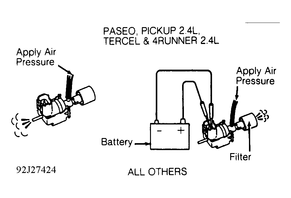 5. Check fuel pressure control VSV operation by applying air pressure to designated area and checking air passage, and then applying battery voltage and ground and retesting. See Fig 1. Replace fuel pressure control VSV if defective.