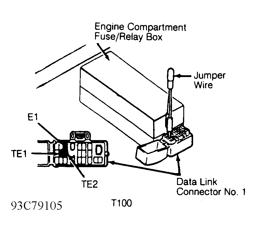 5. Turn ignition on with engine off. Install Jumper Wire (SST 09843-18020) between terminals "T" (Tercel) or TE1 (all others) and E1 in Data Link Connector (DLC). See Figure.