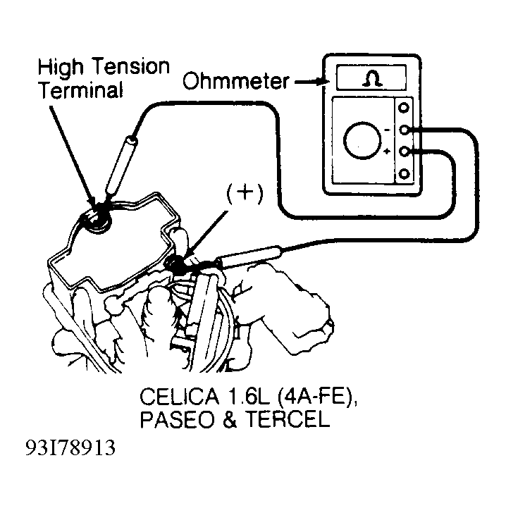 - Check secondary resistance between ignition coil positive (+) terminal and high tension wire terminal (coil wire tower). See Fig 2. Replace ignition coil if resistance is not within specification. See appropriate IGNITION COIL RESISTANCE table.