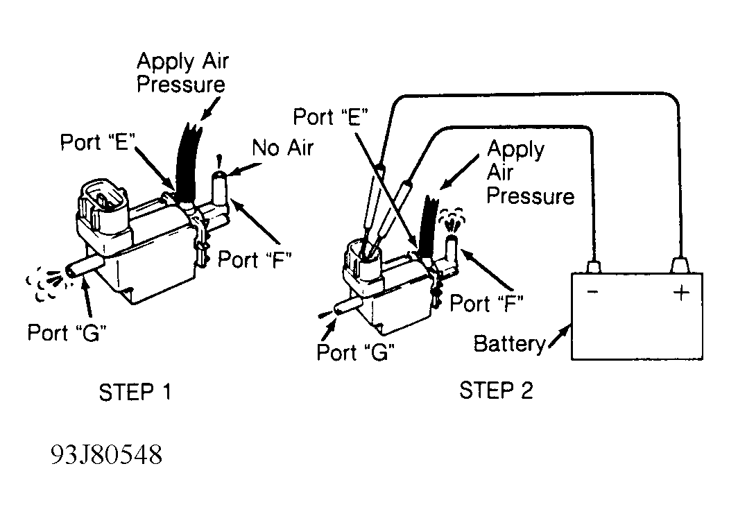 5. Connect battery voltage and ground to VSV terminals. Apply air pressure to port "E". Ensure air passes out port "F" and not port "G" . Perform STEP 2. See Fig 2. Replace VSV if defective.