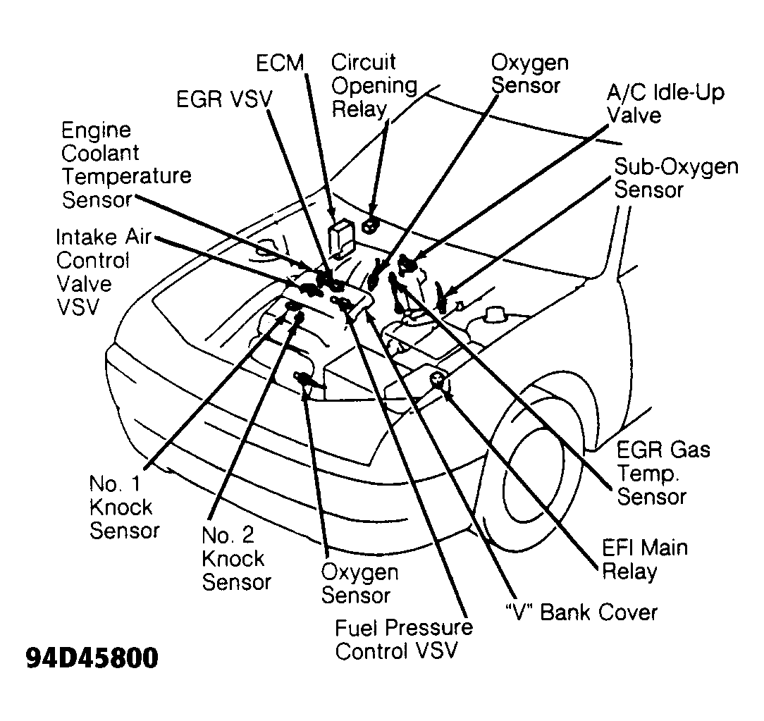- Disconnect negative battery cable. Remove "V" bank cover, located on top of engine. See Fig 3. Disconnect electrical connector from intake air control valve Vacuum Switching Valve (VSV), located near valve cover. See Fig 3.NOTE: It may be necessary to remove emission control valve assembly which contains the intake air control valve VSV and fuel pressure control VSV for access to intake air control valve VSV.