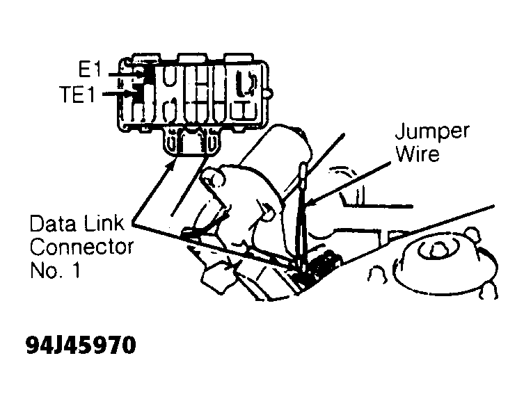 - Install Jumper Wire (SST 09843-18020) between terminals TE1 and E1 of data link connector No. 1, located in engine compartment. See Figure.NOTE: The EGR system components can be checked with engine coolant temperature less than minimum temperature and engine at specified engine RPM.