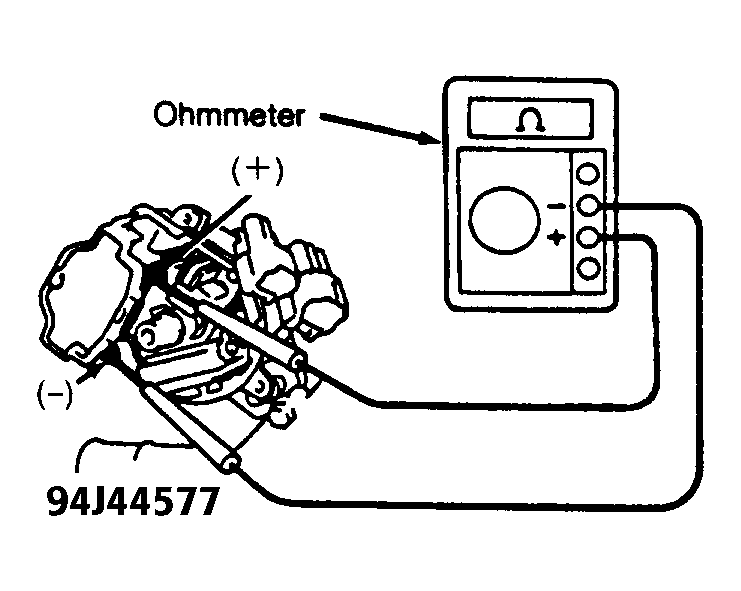 - Disconnect wiring from ignition coil so ignition coil is isolated from system. Using ohmmeter, check primary resistance between ignition coil positive (+) and negative (-) terminals. See Fig 1.