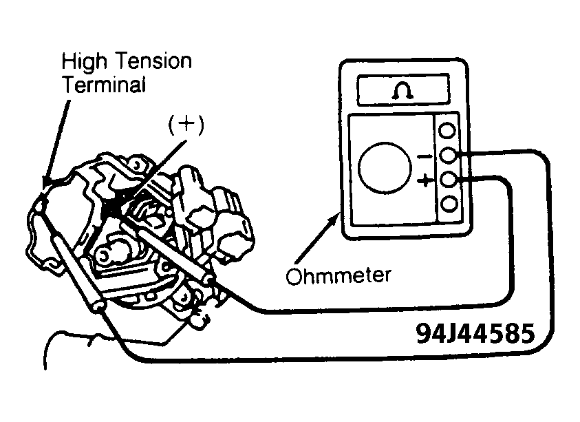 - Check secondary resistance between ignition coil positive (+) terminal and high tension terminal (coil wire tower). See Fig 2. Replace ignition coil if resistance is not within specification. See appropriate IGNITION COIL RESISTANCE table.