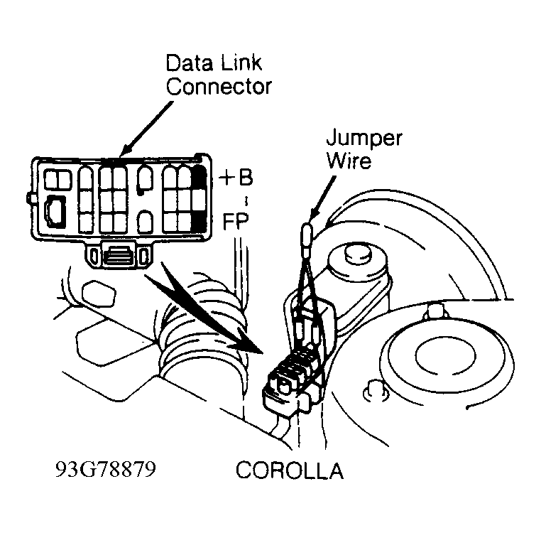 4. Install jumper wire between +B and FP terminals of data link connector. See Figure. Data link connector is located in engine compartment.