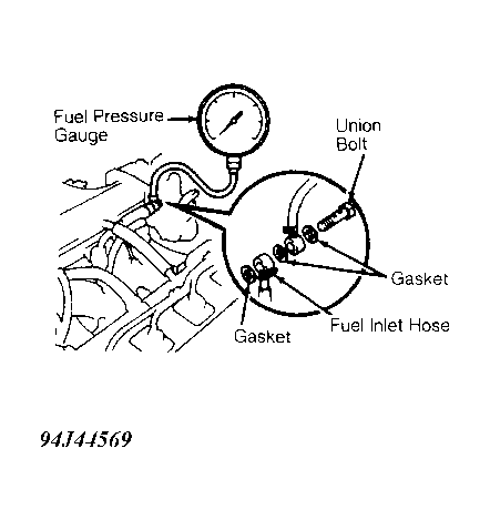 3. Remove union bolt and gaskets. Install Fuel Pressure Gauge (SST 09268-45012) using NEW gaskets. See Fig 1. Tighten union bolt. Reconnect negative battery cable.