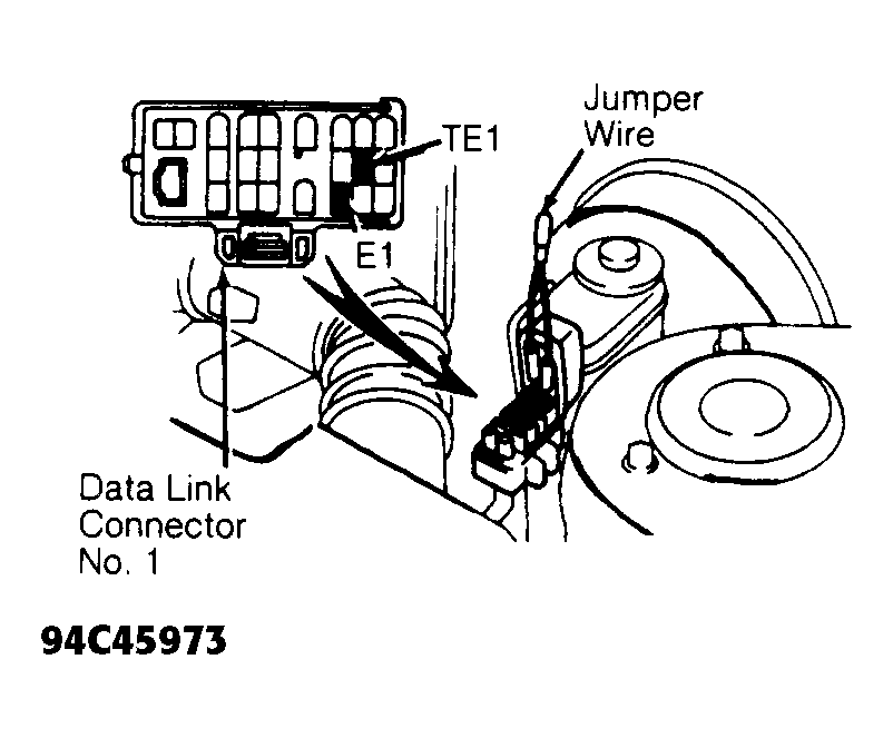 3. Install Jumper Wire (SST 09843-18020) between terminals TE1 and E1 of data link connector No. 1, located in engine compartment. See Figure.