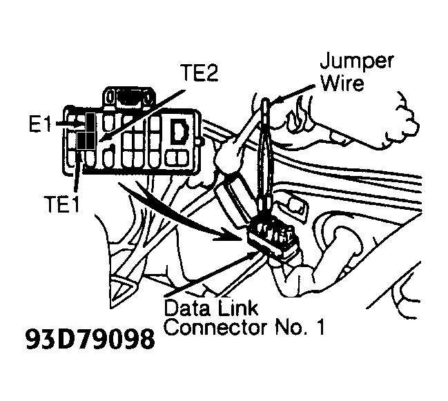 - Install Jumper Wire (SST 09843-18020) between terminals TE2 and E1 in Data Link Connector (DLC) with ignition off. See Fig 1.