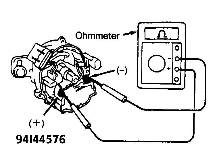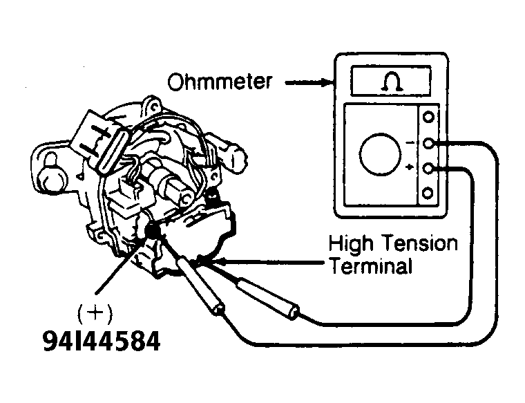 - Disconnect wiring from ignition coil so ignition coil is isolated from system. Using ohmmeter, check primary resistance between ignition coil positive (+) and negative (-) terminals. See Fig 1 and Fig 2.