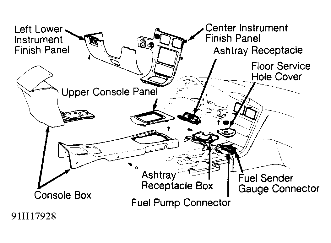 - Disconnect negative battery cable. Remove upper console panel by prying sides. Remove screws retaining interior console box. See Fig 1. Remove left lower instrument finish panel. Remove ashtray. Remove center instrument finish panel. Remove ashtray receptacle retainer.