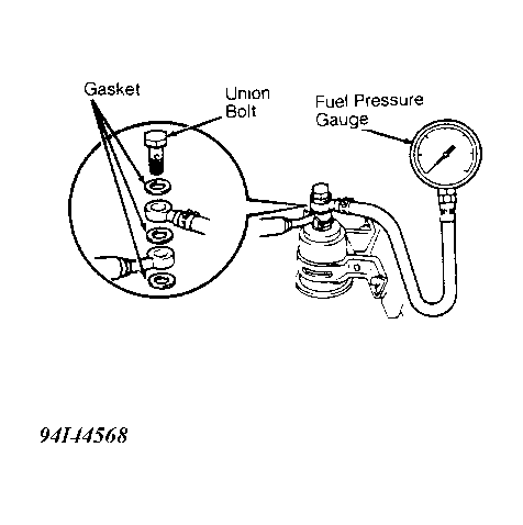 3. Remove union bolt and gaskets. Install Fuel Pressure Gauge (SST 09268-45012) using NEW gaskets. See Fig 1. Tighten union bolt. Reconnect negative battery cable.