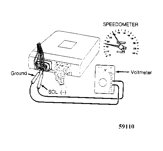 Raise and support vehicle. Remove center console. DO NOT disconnect computer connector. Start engine. Using a voltmeter, measure voltage between terminals GND and SOL (-) of computer connector. See COMPUTER VOLTAGE SPECIFICATIONS table. See Fig 1. If voltage is not as specified, replace computer.