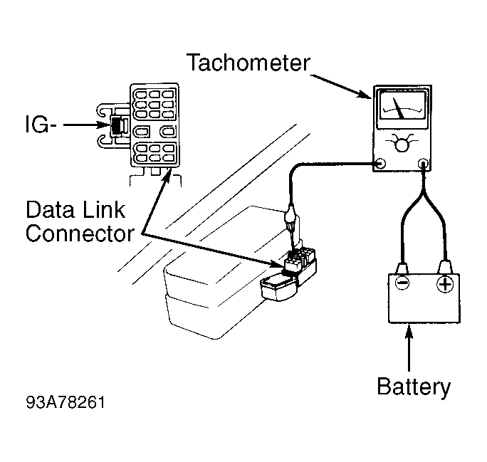 - Warm engine to normal operating temperature. Shut engine off. Connect timing light. Connect tachometer to proper terminals of data link connector. See Fig 1.