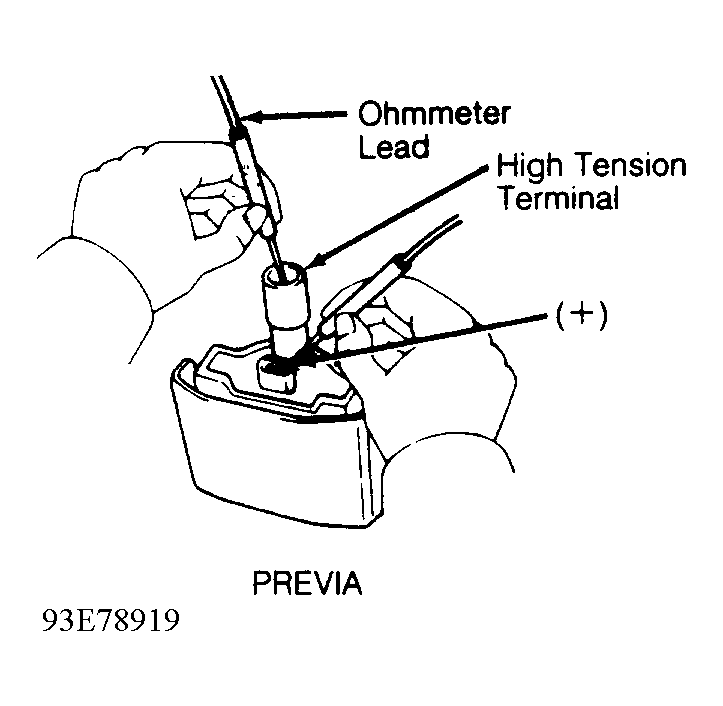 - Check secondary resistance between ignition coil positive (+) terminal and high tension terminal (coil wire tower). See Fig 2. Replace ignition coil if resistance is not within specification. See appropriate IGNITION COIL RESISTANCE table.