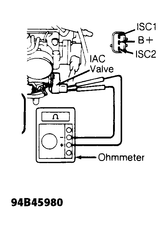 - To check IAC valve resistance, ensure ignition is off. Disconnect electrical connector from IAC valve located on lower area of throttle body. Using ohmmeter, measure resistance between terminal B+ and each remaining terminal. See Fig 3.