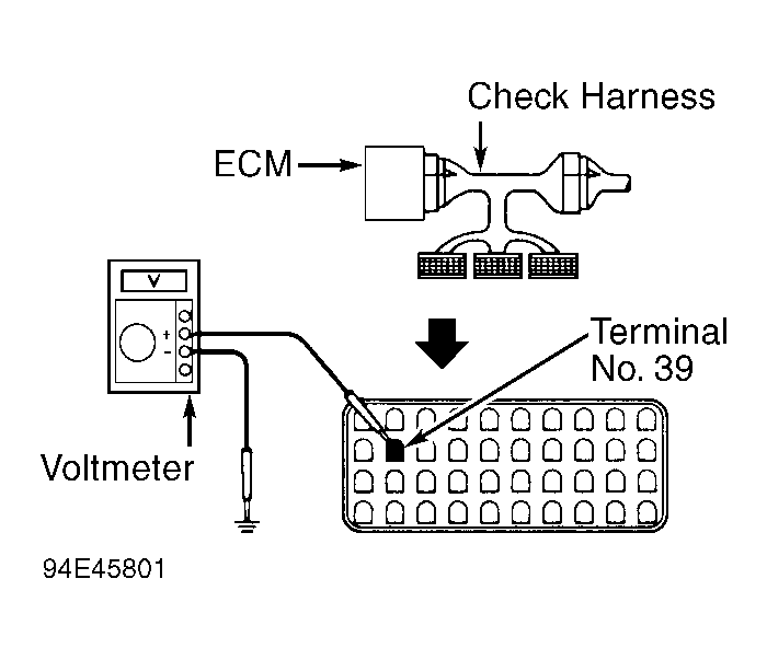 - Install Check Harness (SST 09990-01000) between ECM and ECM electrical connector. See Fig 4. Turn ignition on. Check voltage between terminal No. 39 and chassis ground. See Fig 4.