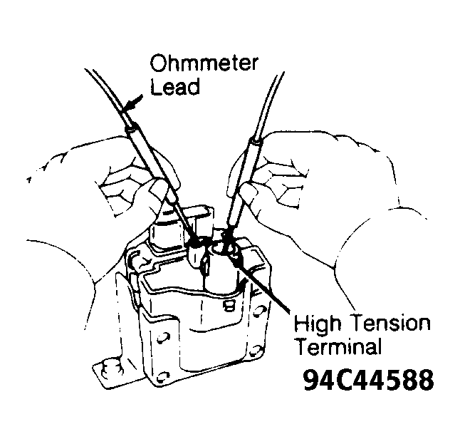 - Check secondary resistance between ignition coil positive (+) terminal and high tension terminal (coil wire tower). See Fig 2. Replace ignition coil if resistance is not within specification. See appropriate IGNITION COIL RESISTANCE table.