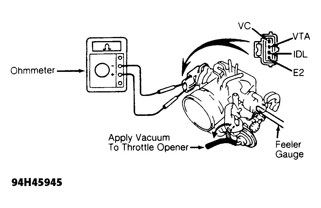 - Turn ignition off. Disconnect electrical connector from Throttle Position Sensor (TPS) on throttle body. Note terminal identification. See Fig 1 and Fig 2.