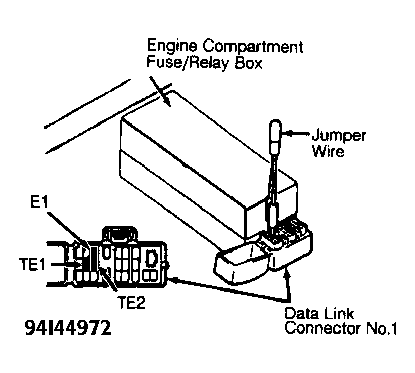 - Stop vehicle, but DO NOT turn engine off. Install jumper wire between terminals TE1 and E1 in DLC. See Fig 1. Count number of flashes from MIL on instrument panel. If system is operating properly (with no trouble codes), MIL will flash continuously and evenly. See Fig 2.