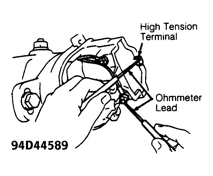 2. Check secondary resistance between ignition coil positive (+) terminal and high tension terminal (coil wire tower). See Fig 3 and Fig 4. Replace ignition coil if resistance is not within specification. See appropriate IGNITION COIL RESISTANCE  table.