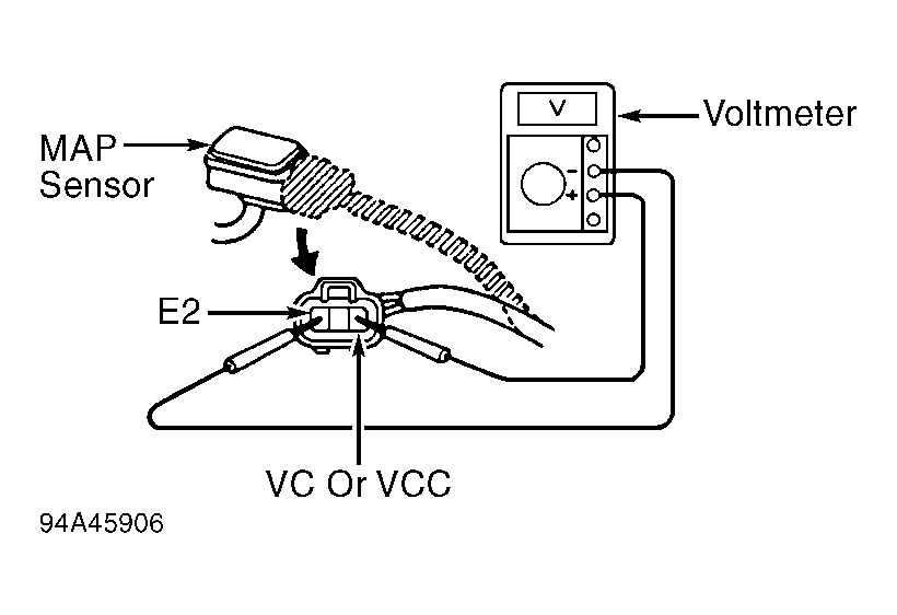 - Turn ignition on. Using voltmeter, measure voltage between terminals VC or VCC and E2 of electrical connector on wiring harness. See Fig 1. The VC or VCC and E2 terminals are the 2 outer terminals on all models. Voltage should be within specification. See MAP SENSOR SUPPLY VOLTAGE SPECIFICATIONS table.MAP SENSOR SUPPLY VOLTAGE SPECIFICATIONS