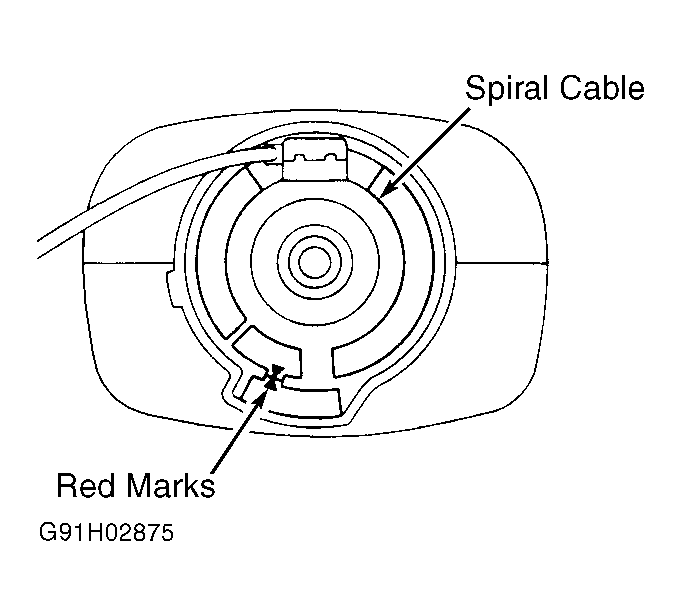 On vehicles equipped with air bag system, spiral cable MUST be correctly adjusted to ensure proper air bag operation. Ensure front wheels are in straight-ahead position. Turn spiral cable (located on combination switch) counterclockwise by hand until it becomes harder to turn cable. Turn spiral cable clockwise about 3 turns and ensure Red marks align and are visible through inspection hole. See Fig 1.
