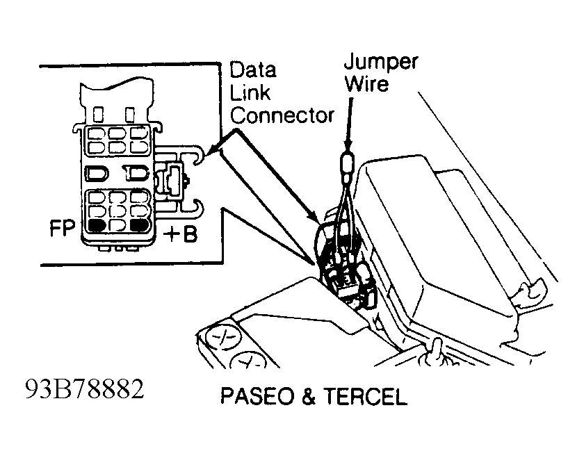 1. Install Jumper Wire (SST 09843-18020) between +B and FP terminals of data link connector. See Fig 1. Data link connector is located in engine compartment.