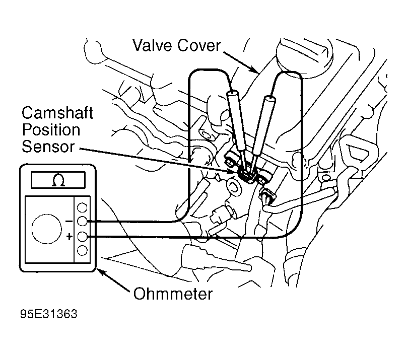 1. Disconnect electrical connector from camshaft position sensor, located on rear corner of front cylinder head, just below valve cover. See Fig 1. Using ohmmeter, measure resistance between electrical terminals on camshaft position sensor. See Fig 1.