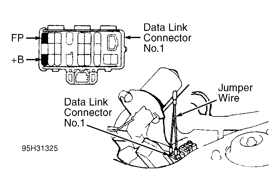- Install Jumper Wire (SST 09843-18020) between +B and FP terminals of data link connector No. 1. See Fig 1.NOTE: Data link connector No. 1 is located in engine compartment.