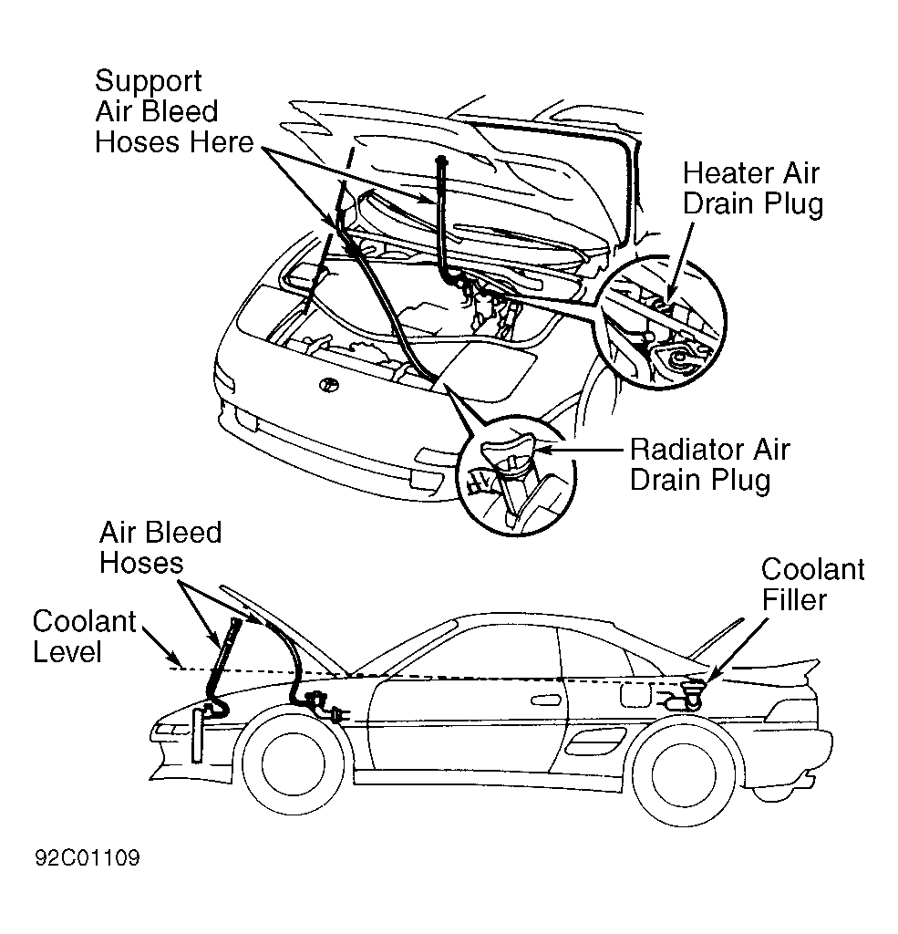 - If coolant level in air bleed hoses is lower, air still exists in cooling system. Check for pinched or restricted air bleed hoses and repeat step 3). When proper coolant level is obtained in air bleed hoses, close heater and radiator air drain plugs. Remove air bleed hoses.