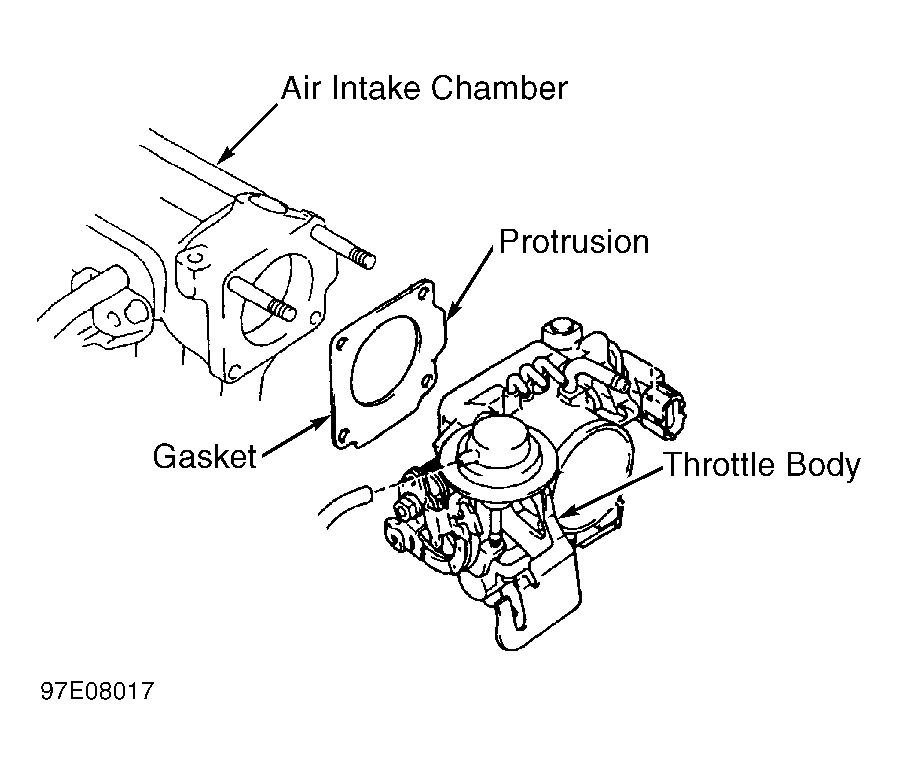 - To install, reverse removal procedure using NEW gaskets. Ensure gasket for throttle body is installed with protrusion facing downward. See Figure.
