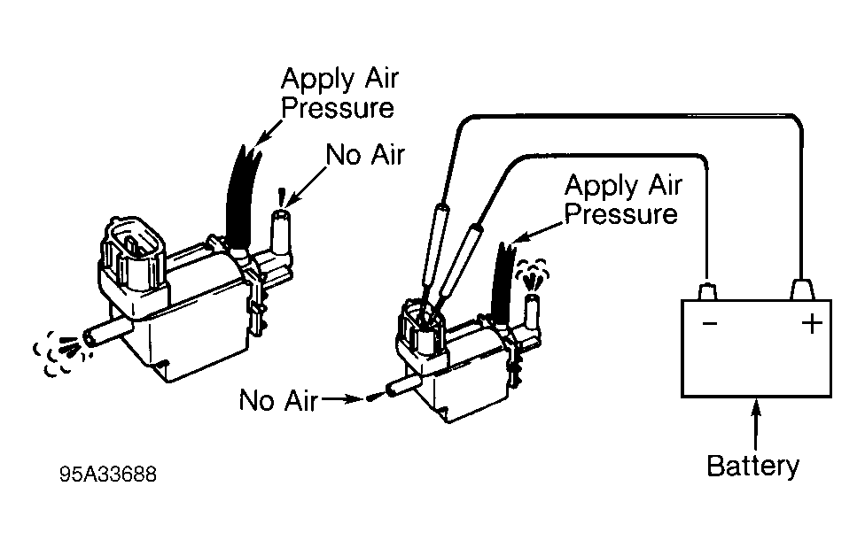 5. Check fuel pressure control VSV operation by applying air pressure to designated area and checking air passage, and then applying battery voltage and ground and retesting. See Fig 1. Replace fuel pressure control VSV if defective.