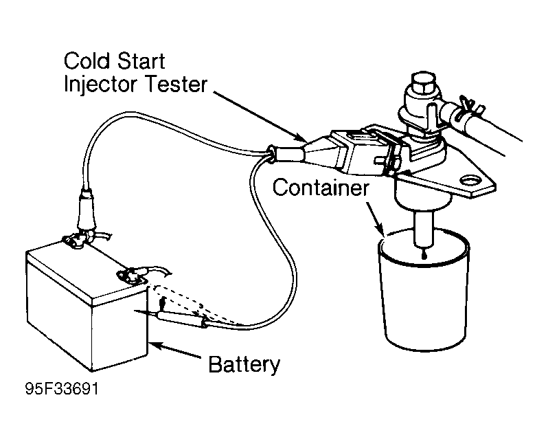 6. Connect cold start injector tester to battery. See Figure. Ensure fuel spray pattern is an even cone shape. Disconnect cold start injector tester from battery.