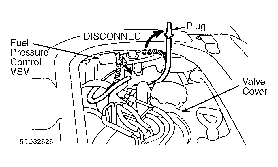 - Remove jumper wire from data link connector No. 1. Start engine and allow to idle for at least 2 minutes. Disconnect vacuum lines at fuel pressure control Vacuum Switching Valve (VSV), located near valve cover at front of engine. See Fig 1. Plug vacuum line at in take manifold side of fuel pressure control VSV. Note fuel pressure with vacuum hoses disconnected.