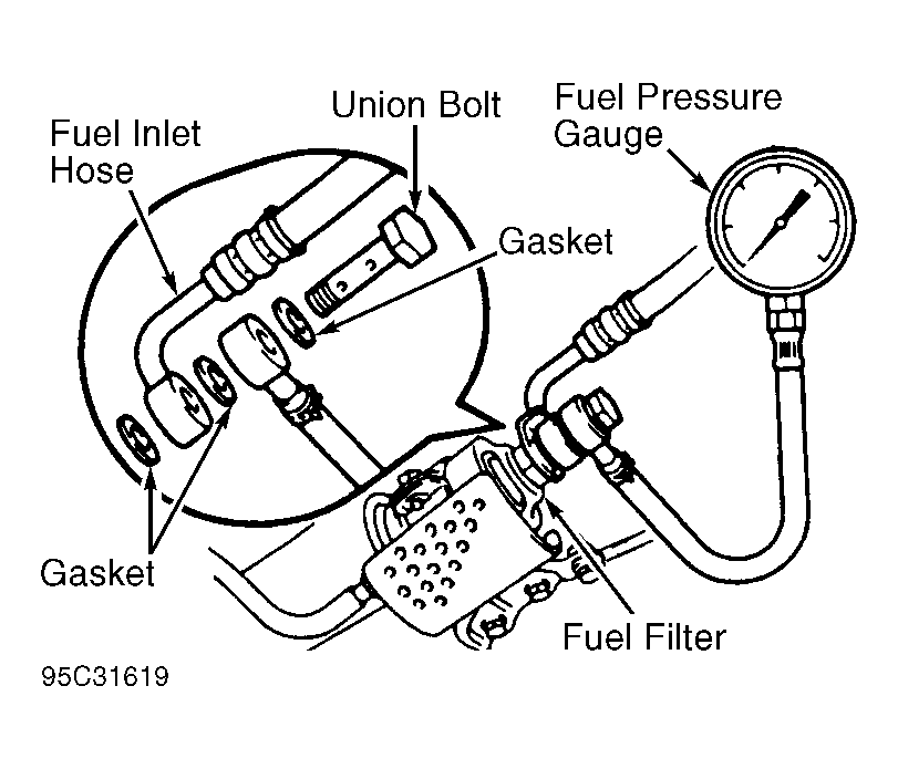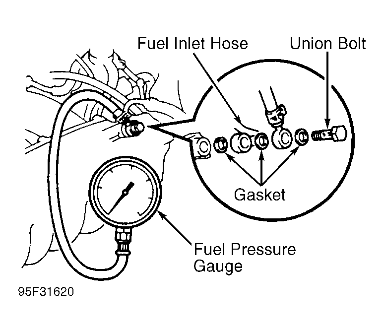 - Disconnect negative battery cable. Remove fuel pressure gauge. Reinstall union bolt using NEW gaskets. Tighten union bolt. Install negative battery cable.