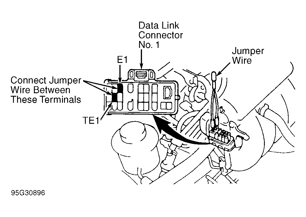 - Install Jumper Wire (SST 09843-18020) between terminals TE1 and E1 of data link connector No. 1. See Fig 2.
