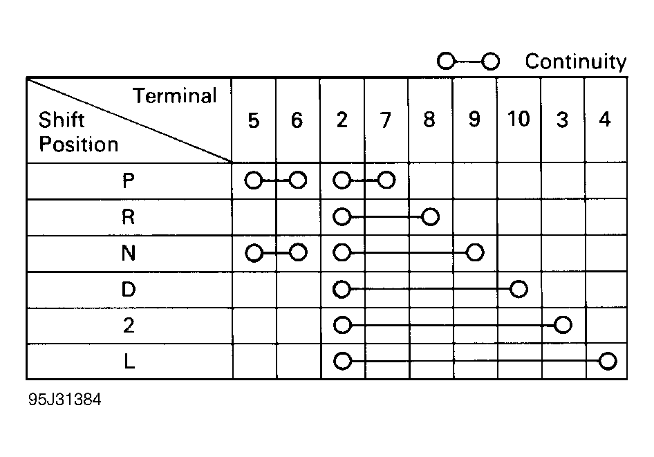 1. Disconnect PNP switch harness connector. PNP switch is located at transmission where shifter select cable is mounted. Using ohmmeter, check continuity of switch terminals in specified positions. See Fig 1 and Fig 2. Replace as needed.